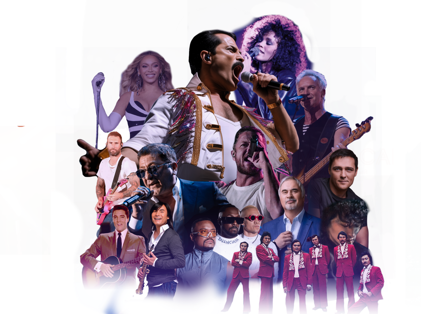 С одной стороны, на сцене прозвучат бессмертные композиции таких легенд, как Elvis Presley, Whitney Houston, Beyoncé, Maroon 5, Imagine Dragons, Queen, Black Eyed Peas, Sting.